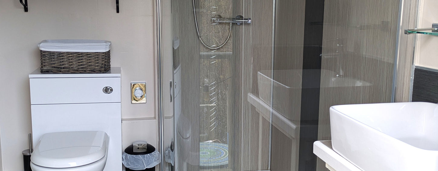 The well-appointed shower-room has a proper flushing toilet and a large walk-in shower with plenty of hot water and good water pressure. The fully equipped fitted kitchen has a gas cooker, with hob and oven, and a small fridge.
